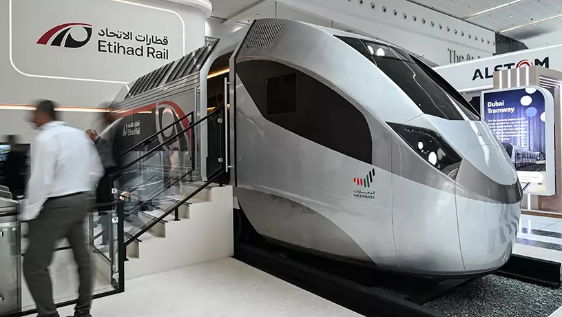 На конференции Global Rail в Абу‑Даби Etihad Rail впервые представила интерьеры будущих пассажирских поездов. На стенде показали серебристый макет вагона с черно‑красным логотипом компании. Это прототип, а не финальный дизайн. Запуск пассажирского сообщения в ОАЭ запланирован на 2026 год, время в пути между Абу‑Даби и Дубаем должно составить 57 минут.